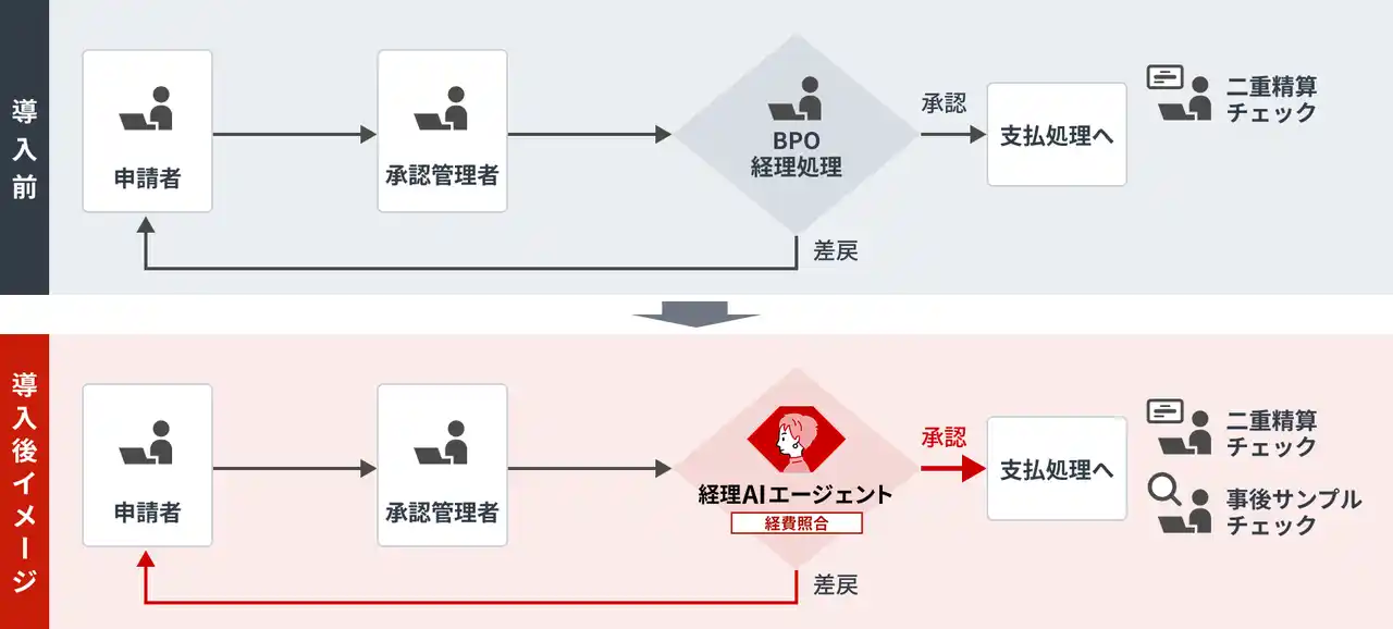 これまでBPOが手作業で担っていた承認業務を、AIエージェントによる承認・差し戻しへと置き換えます。これにより、同業務での標準化をいっそう進めるとともに、BPO負荷を軽減し、更なる業務委託、高度化を目指します。 |