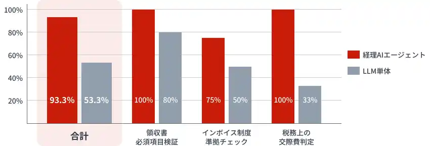 ファーストアカウンティングが培ってきた経理・財務領域の業務ロジックとLLMを組み合わせた「経理AIエージェント」の有効性を検証するため、「領収書必須項目の確認」「インボイス制度への準拠チェック」「税務上の交際費判定」の3つの項目について、同一のデータを用い、LLM単体とAIエージェントによる判定結果を比較しました。 |