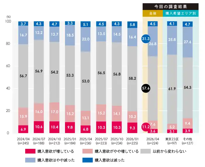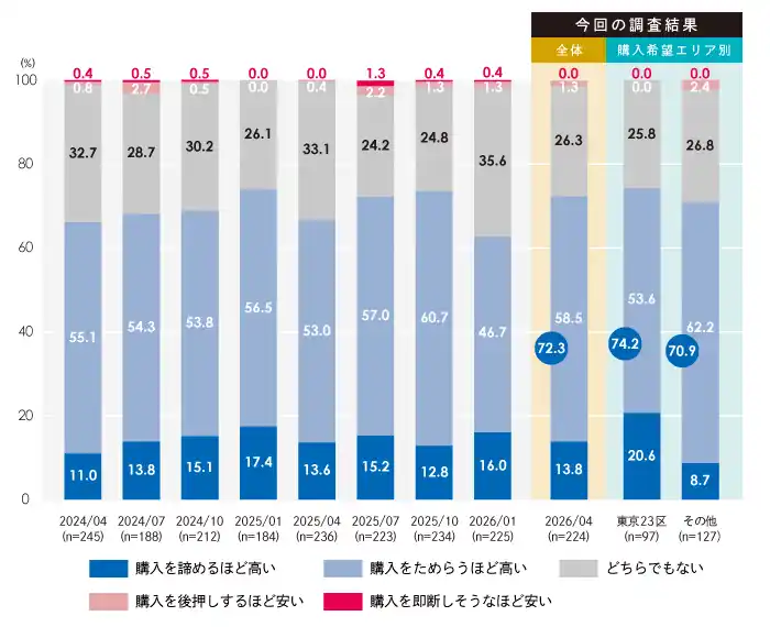 こうした価格の重圧と金利上昇を背景に、「買い時」と回答した層(「買い時」+「やや買い時」の合計)は33.0%となりました。2025年7月に記録した44.8%をピークに下落基調が続き、直近1年間で最も低い水準へと落ち込んでいます。 |