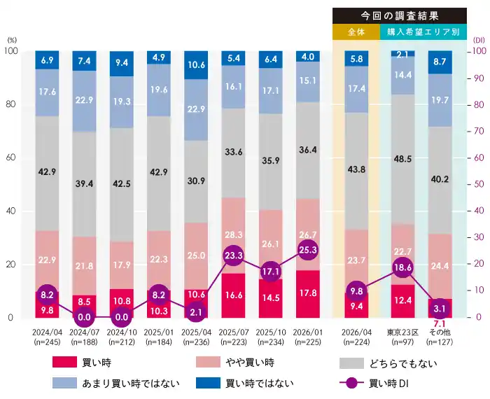 市場の強弱感を示す買い時DI(※)は9.8ポイントとなり、前回調査の25.3ポイントから15.5ポイントもの急落となりました。「高い価格にはそろそろ慣れてきた」と感じ始めていた購入検討者が、そこへ金利上昇という追加コストへの警戒感が重なったことで、改めて踏み出せなくなったという心理的な揺り戻しが、この急落の背景にあると読み取れます。 |