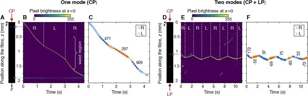さらに、2つの光を逆方向から入射させる「対向伝搬モード」を導入することで、ナノ粒子を光の進行方向に押し流す光圧の内で、非キラル成分を完全に相殺でき、ナノ粒子の掌性のみに依存した光圧を選択的に作用させることに成功しました。この条件下ではRCPとLCPで粒子の輸送方向が逆転することが確認され、偏光を周期的に切り替えることでナノ粒子をファイバー上の約0.25 mmの範囲内で前方または後方に輸送可能なことを実証しました。 |