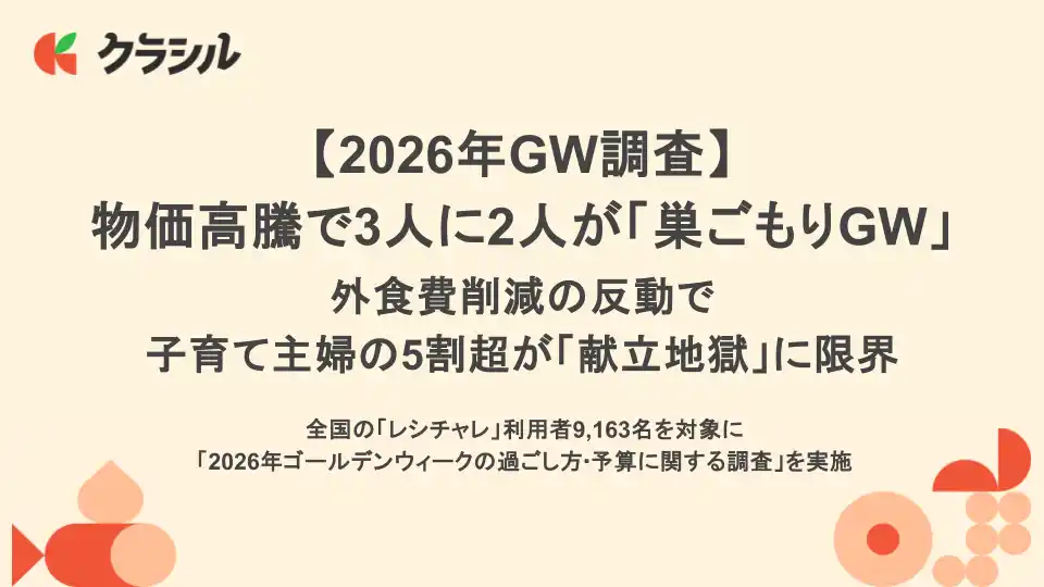 クラシル株式会社(本社:東京都港区、代表取締役社長:堀江 裕介、以下「クラシル」)が運営する節約アプリ「レシチャレ」は、全国の「レシチャレ」利用者9,163名を対象に「2026年ゴールデンウィークの過ごし方・予算に関する調査」を実施しました。 |