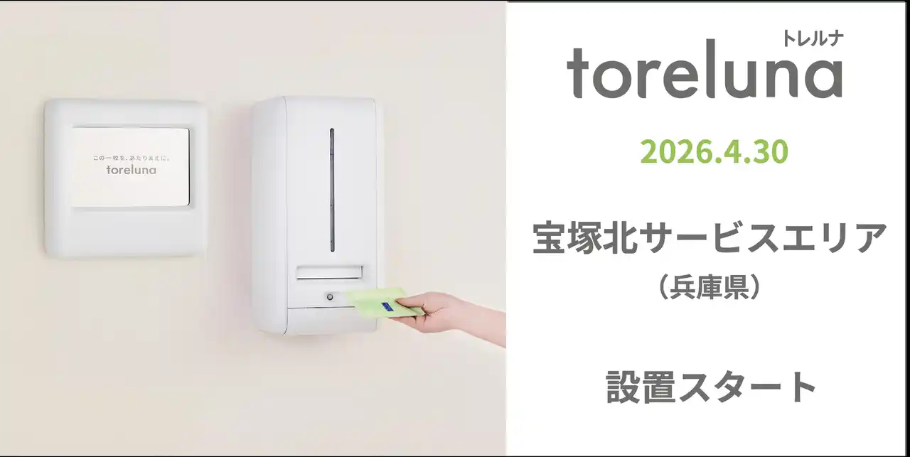 株式会社ネクイノ(大阪市北区、代表取締役:石井 健一)は、トイレの個室で生理用ナプキンを常備し無料で提供するサービス「toreluna(トレルナ)」(以下 トレルナ)を、宝塚北サービスエリアへ設置し、サービスの提供を開始いたします。なお、トレルナのサービスエリアへの導入は、今回が初めての取り組みとなります。 |