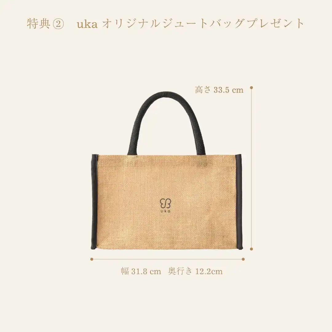 特典2. セットをご購入の方に、ukaオリジナルジュートバッグをプレゼント(ギフトボックスがぴったり入るサイズ!) |