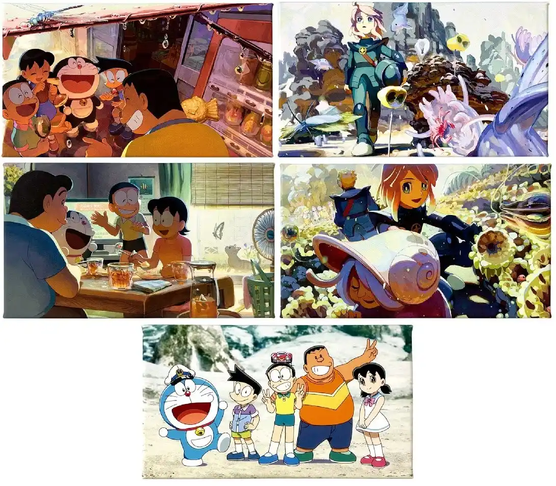 | 映画のエンディングに登場するイラストである「ジャイアンの家」「見上げるエル」「野比家の団らん」「農作業手伝い」や、作中でのび太たちが海底キャンプの記念に撮った「集合写真」、深海の冒険を表現した3連ビジュアル「海底探検A/B/C」の全8種をご用意。 | ||||||||||||||||