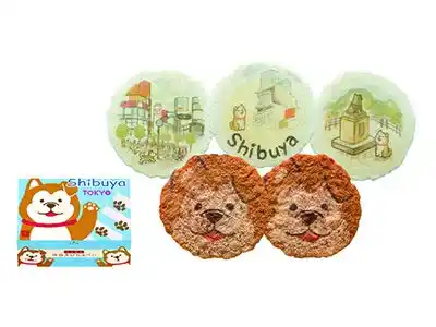 ハチ公をイメージしたかわいいわんこを描いたパッケージ。渋谷の街をお散歩するわんこを描いたえびせんべいを詰合せました。