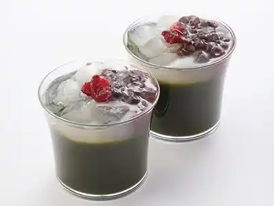 香り高い抹茶ゼリーに、もっちりとしたわらび餅と、粒あんをトッピング |