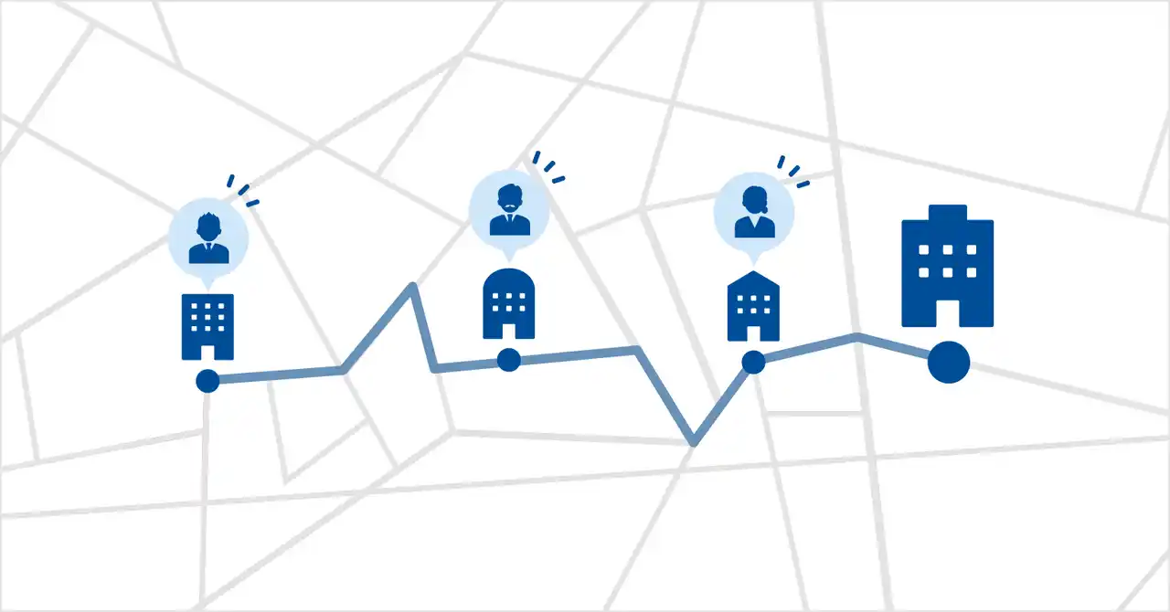 訪問ルートメーカーは、過去に名刺交換をした企業をアプリの地図上に表示し、そこからユーザーが訪問したい企業を複数選択することで、効率的な訪問ルートを作成できる機能です。たとえば、すでに決まっている訪問先の周辺で他の企業にも立ち寄りたい場合や、出張の合間に時間が空いた際に現在地周辺の顧客を訪問したい場合など、限られた時間の中でより多くの顧客接点を創出する手段として活用できます。 |