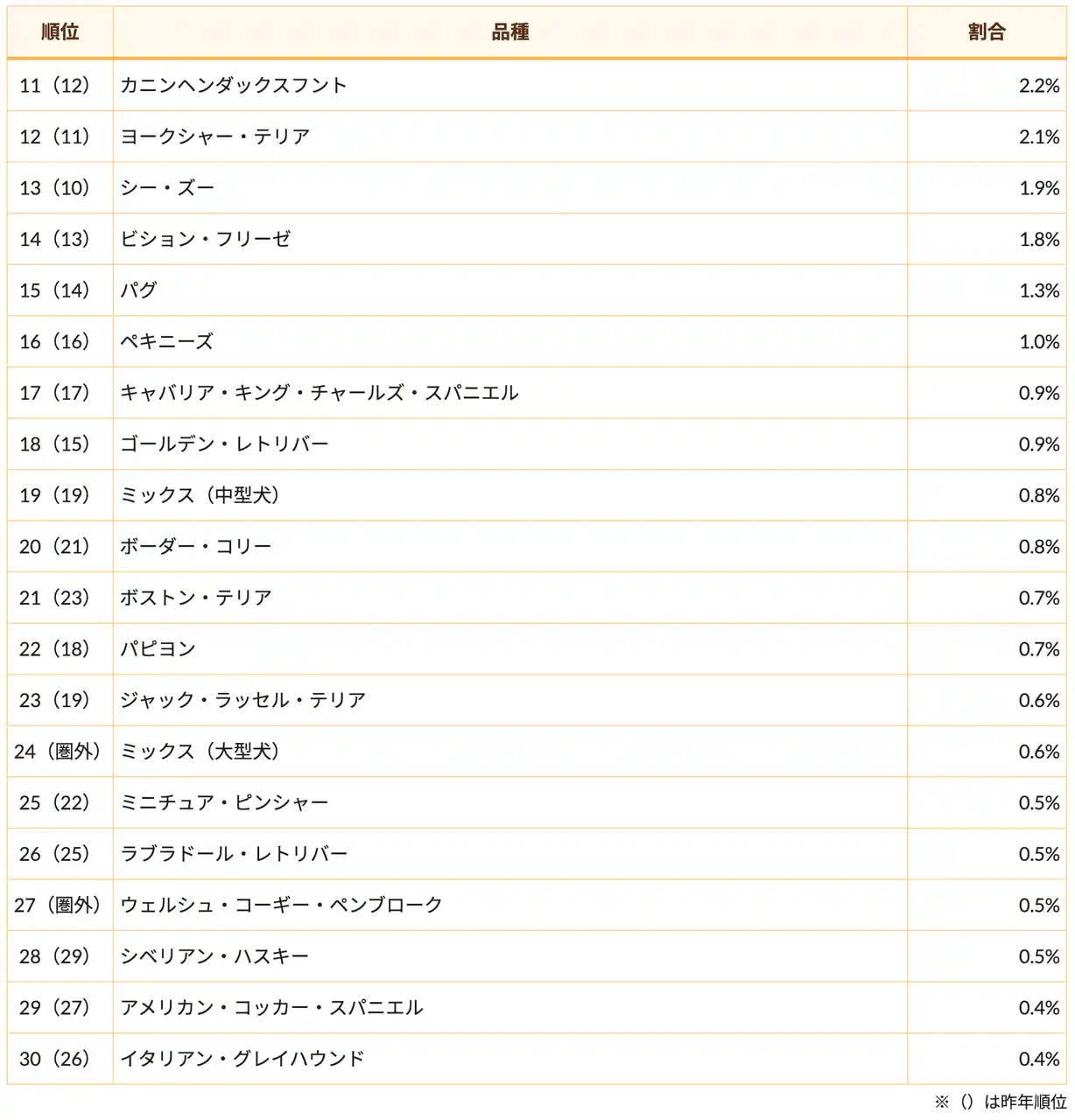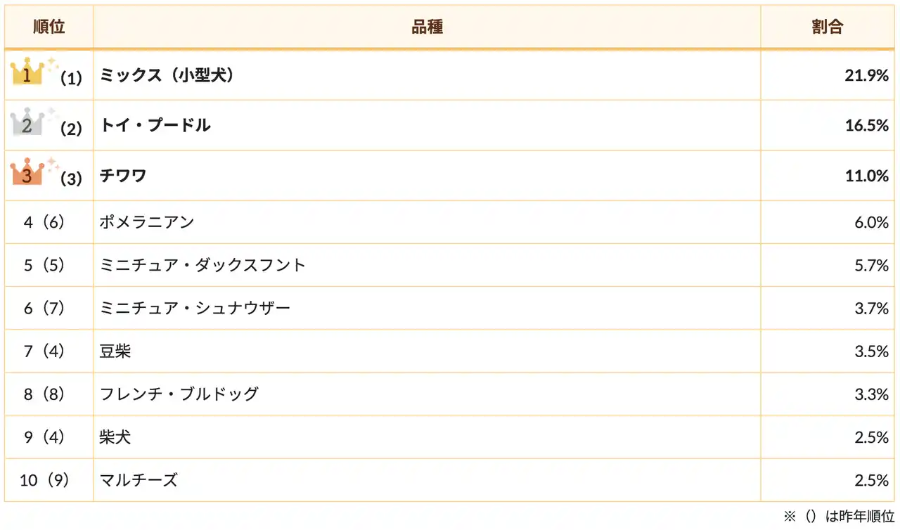 定番のトイ・プードル、チワワは昨年同様の順位をキープしており、安定した支持の厚さがうかがえます。 |