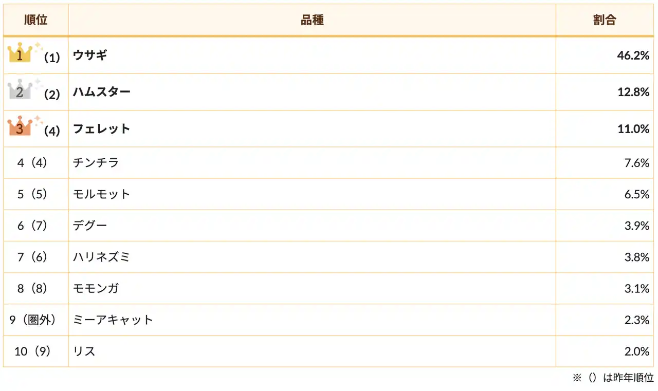 割合から見てもその人気がうかがえますが、長い耳にモフモフした毛並みという愛くるしさを考えれば、この人気も納得の結果です。 |