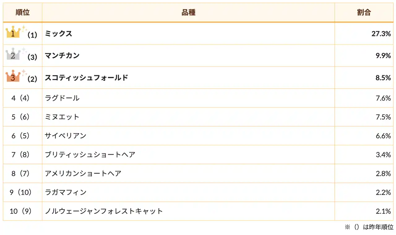 また、トップ10の顔ぶれ自体は昨年と変わらず、順位が多少前後したのみでした。来年もこのまま定番の猫種が人気を維持するのか、あるいは新たな勢力が首位に躍り出るのか、今から来年が楽しみです。 |