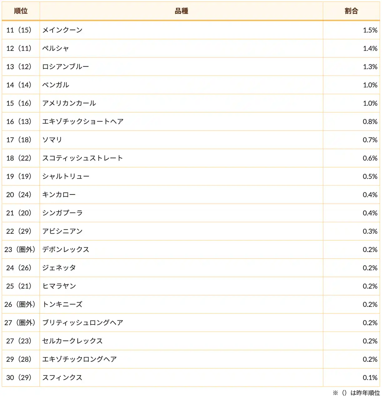 首位の顔ぶれが安定している一方で、11位から30位のランキングには大きな変化がありました。なんと昨年は惜しくも圏外だった猫種が、今年は新たに3品種もランクインしました! |
