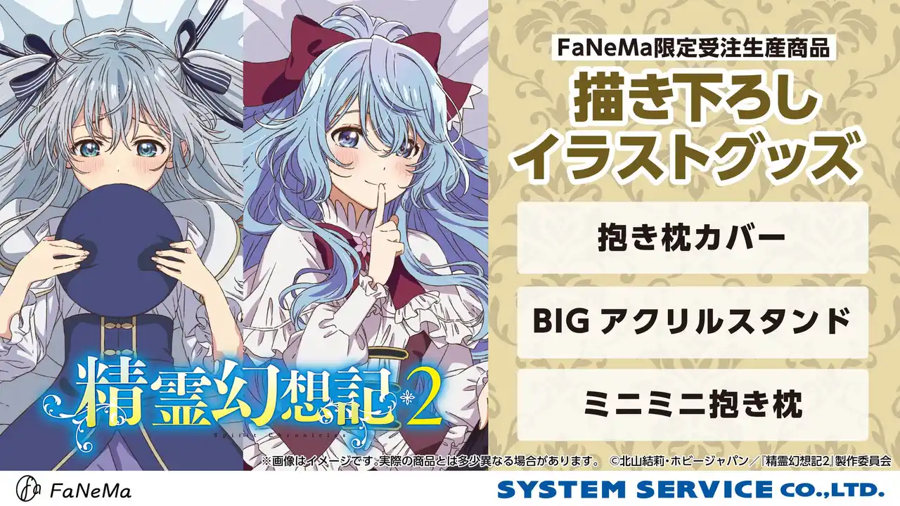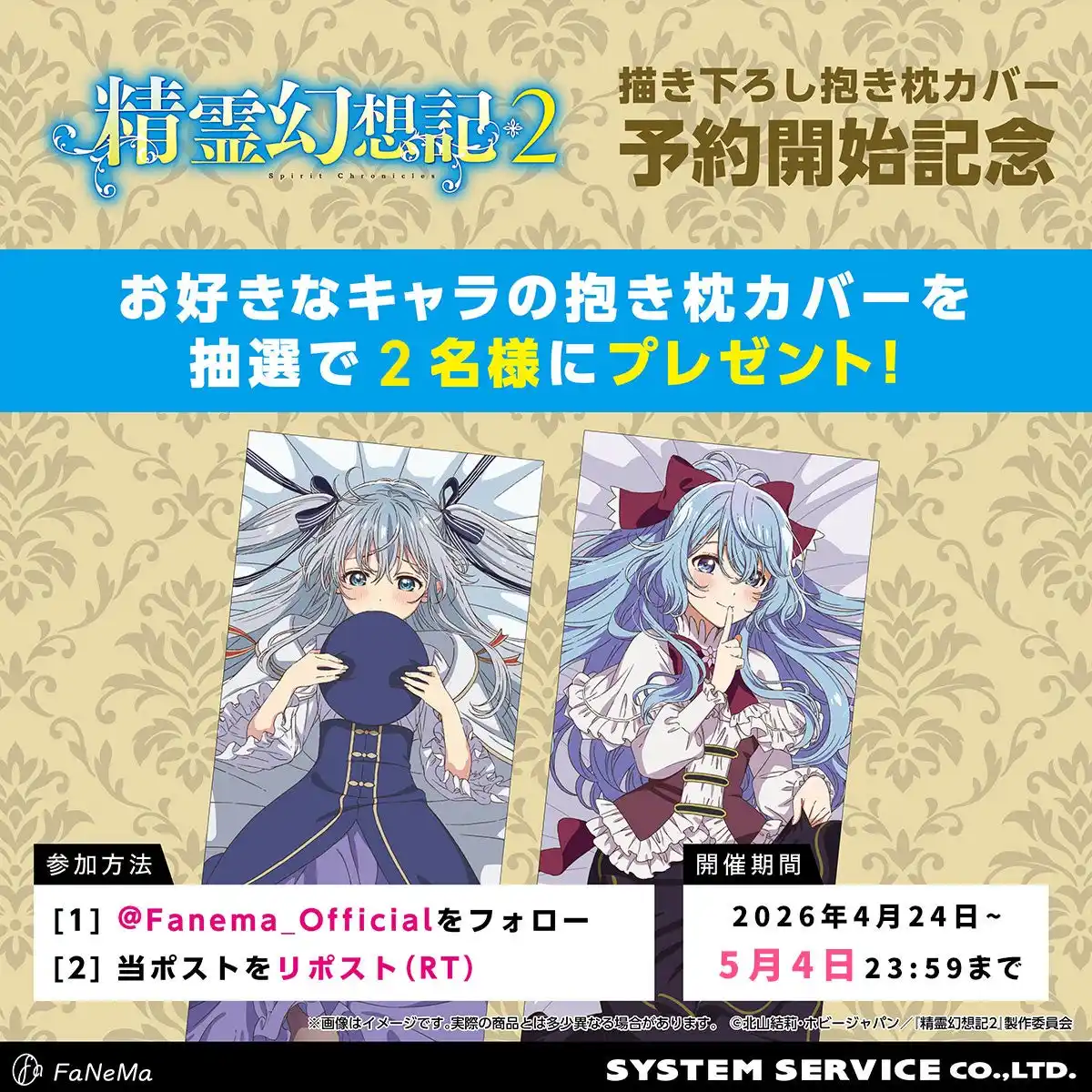 システムサービス株式会社(本社:東京都豊島区、代表取締役社長:田村宗弘)は、アニメ・マンガ・ゲーム作品等のキャラクター商品の企画・製作・販売をする自社ECサイト「FaNeMa」(URL:https://fanema.jp/)にて、TVアニメ『精霊幻想記2』より「抱き枕カバー」「ミニミニ抱き枕」「BIGアクリルスタンド」を発売いたします。 さらに、新商品発売を記念したX(旧Twitter)フォロー&リポストキャンペーンも実施いたします。 |