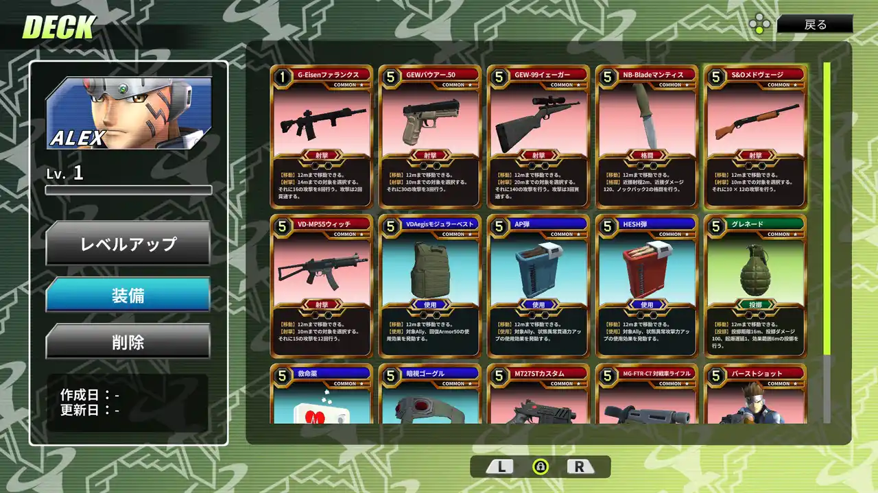 デッキには様々な武器や装備、サポートアイテムがカードとして含まれています。状況に合わせて最適なカードを選択しましょう。 |