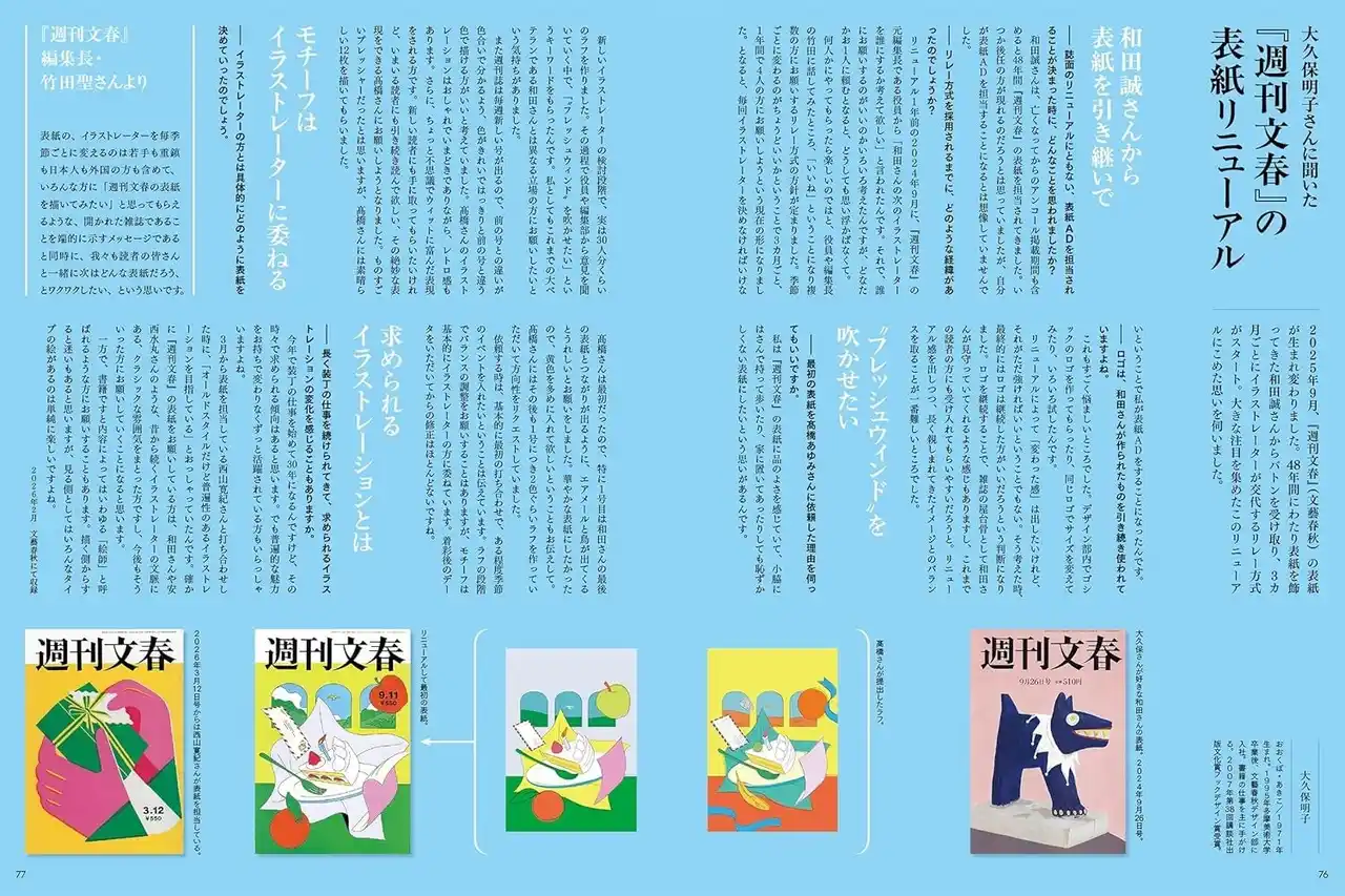 2025年9月にリニューアルされた『週刊文春』(文藝春秋)の表紙について、表紙ADを務める文藝春秋デザイン部・大久保明子さんにインタビュー。和田誠さんからバトンを受け継ぎ、3カ月ごとにイラストレーターが交代する新たな試みについて、その背景を伺いました。 |