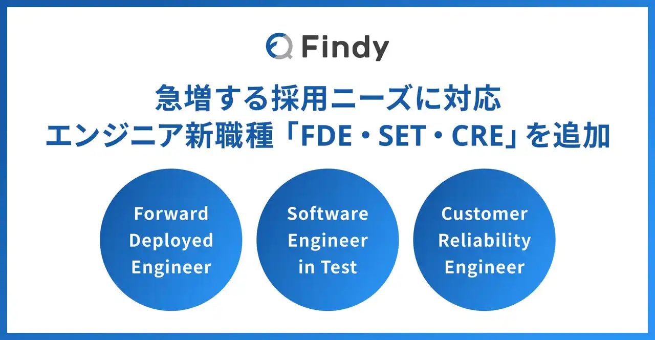 ファインディ株式会社(本社:東京都、代表取締役:山田 裕一朗、以下「当社」)は、ハイスキルエンジニア向け転職サービス「Findy」において、新たに「FDE(Forward Deployed Engineer)」「SET(Software Engineer in Test)」「CRE(Customer Reliability Engineer)」の3職種カテゴリを追加したことを発表します。 |