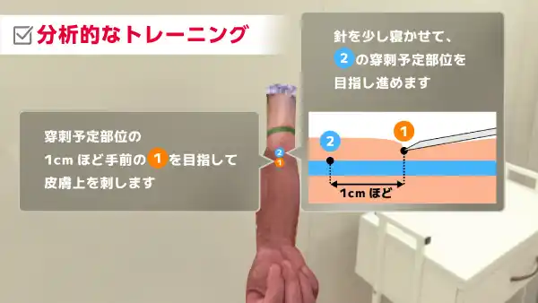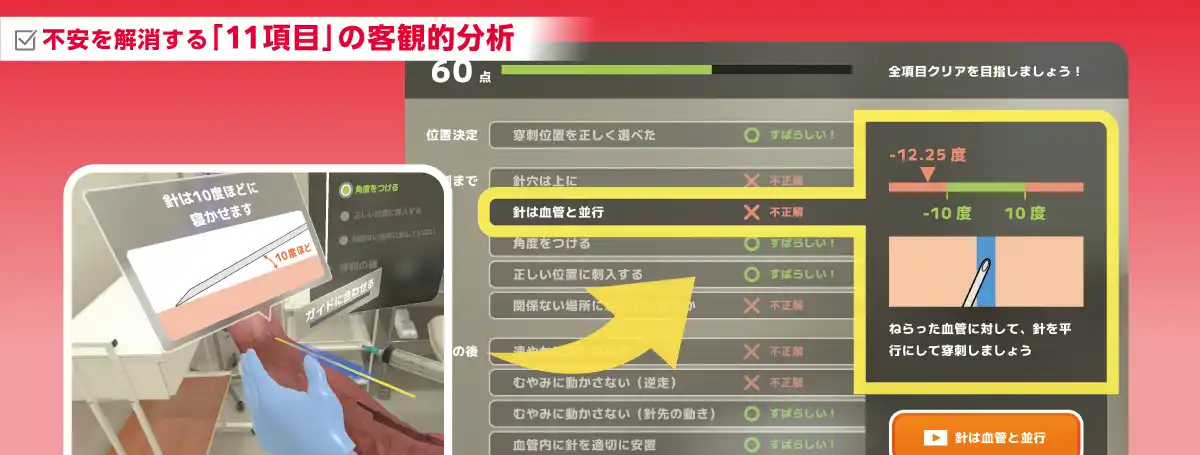 例えば、失敗の原因を「針の角度が血管の走行に対して12.25度ズレていた」と論理的に解説。「何を、どこを、どれだけ改善すれば良いか」が明確になります。 |