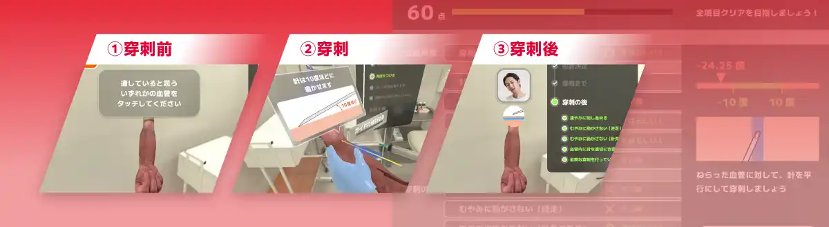 採血VRでは針を刺す正しい位置・角度・深さなどを、音声ガイドや図とともに学習していく。 |