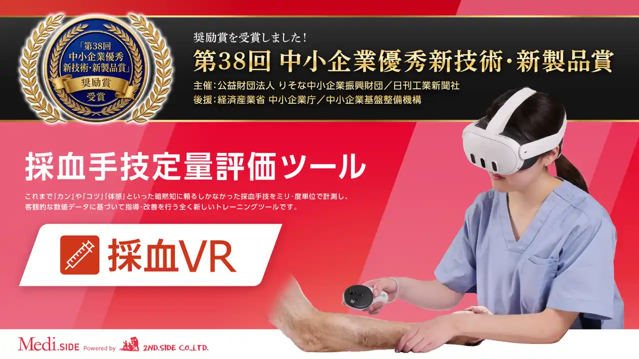 株式会社セカンド・サイド(東京都世田谷区、代表取締役:山下 利明)が開発・販売するデータ駆動型採血訓練ツール「採血VR」が、公益財団法人りそな中小企業振興財団および日刊工業新聞社が主催する「第38回 中小企業優秀新技術・新製品賞」において、奨励賞を受賞しました(後援:経済産業省 中小企業庁/中小企業基盤整備機構)。 |