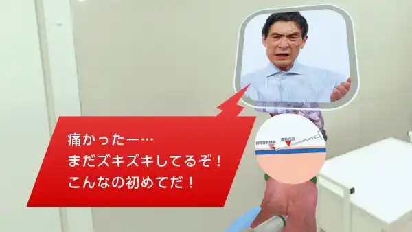 穿刺の位置を誤った場合、患者の苦悶の表情、心の負担を、周囲のダメージ演出として視覚的に表現。 |