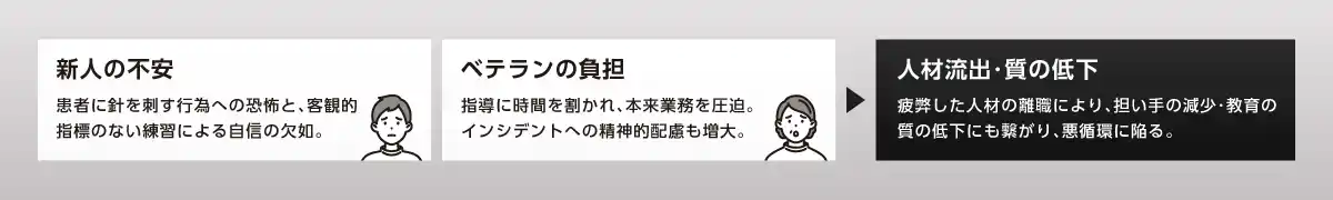 さらに、不安を抱えた新人へのOJT(指導)コストがベテランスタッフに集中し、本来の専門業務を圧迫。疲弊した指導者の離職が教育の質をさらに低下させるという悪循環──「負の連鎖」が、多くの医療現場で起きています。 |