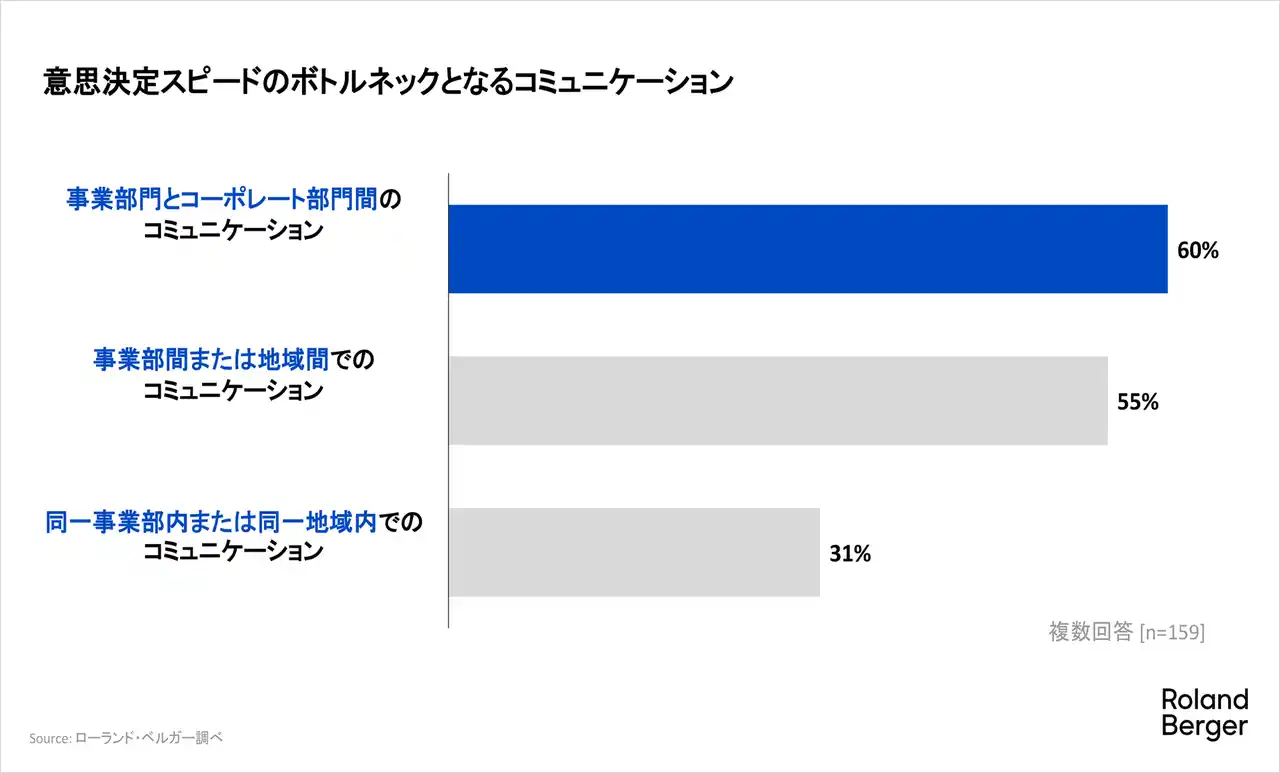 ただ、事業部門とコーポレート部門のコミュニケーションが意思決定のボトルネックと回答した企業は全体の6割に上り、事業部間や地域間を上回ります |