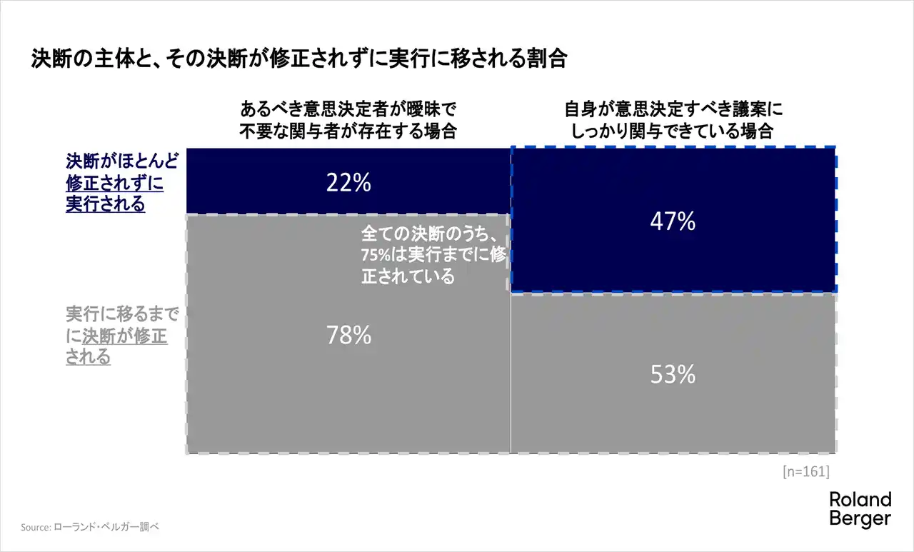 自身が意思決定すべき議案にしっかり関与できている場合、その決断は実行に移るまでに修正されにくい。つまり、正しい関与者による決断は質が高く、組織が余計なループに陥りづらいと言えます。実際、決断の47%は修正されずに実行に移されています |