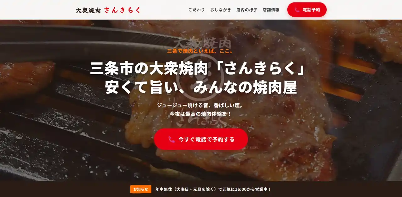 | サービス開始に先立ち、三条市の人気店「さんきらく」様のHP制作およびデジタル活用支援を実施いたしました。長年地域に愛されてきた同店の魅力を、丁寧なヒアリングから要件定義を行い、AIで制作したホームページによって可視化。長年愛されるお店の雰囲気を残しながら、デジタルによる発信力を強化する取り組みを継続しています。地域に根ざした事業者がデジタルを味方につけるモデルケースとして、引き続き伴走してまいります。 | ||||||||||||