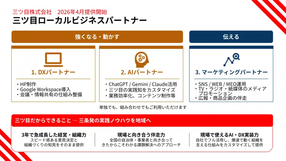 | 三ツ目株式会社(本社:新潟県三条市、代表取締役:澤 正史、以下「三ツ目」)は、主に新潟県内の事業者を対象に、経営・組織課題の解決からプロモーション支援まで包括的に伴走するサービス「地域の『らしさ』を、伴走力とデジタルで加速させる。三ツ目ローカルビジネスパートナー」を2026年4月より本格始動いたします。 | ||||||||||||