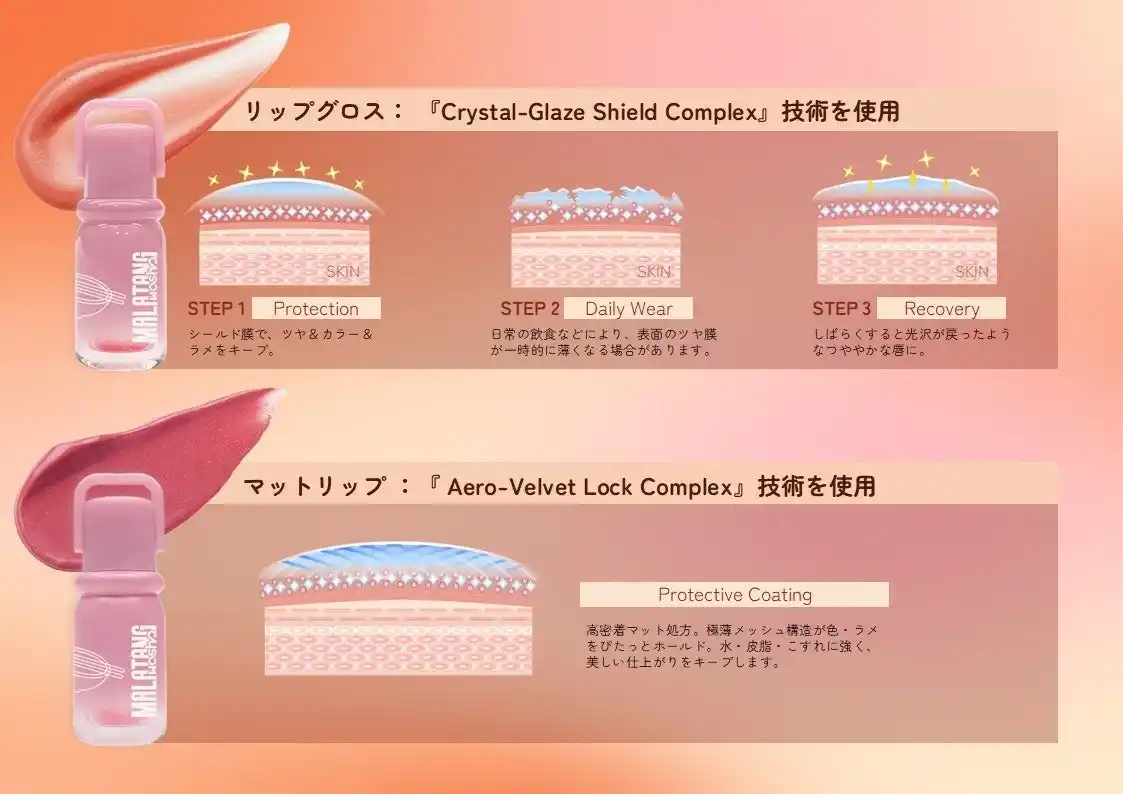 | 落ちにくさの秘密は、独自の成膜技術により形成される「色持ちキープ膜」。グロスタイプは塗布後、約90秒待つことでツヤのある膜が形成され、食事でくずれが気になっても時間とともにツヤ感が整い、塗りたてのような仕上がりへと導きます。マットタイプは極薄メッシュ構造が唇に密着し、水分・油分・摩擦等による崩れを防ぎながら乾燥による縦ジワもぼかし、ふんわりとした質感をキープ*します。 | ||||||
