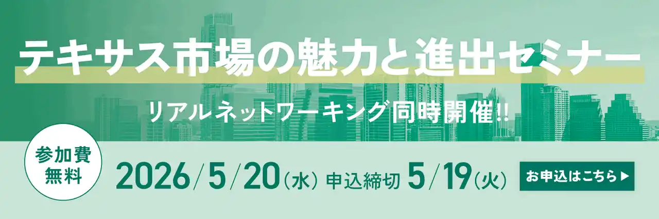 公益財団法人東京都中小企業振興公社(本社:東京都千代田区、理事長:多羅尾 光睦)は、2026年5月20日(水)、世界屈指の成長力を持つテキサス州への進出を支援するセミナー「テキサス市場の魅力と進出セミナー」を、会場でのご参加は東京都立産業貿易センター浜松町館にて、またオンラインでも同時開催いたします。 |