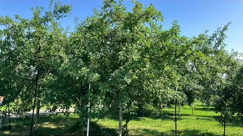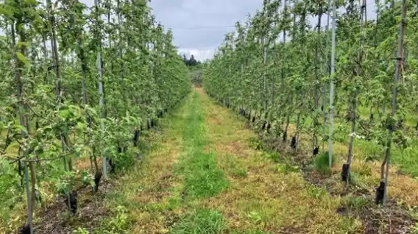 矮化(わいか)性の苗木を直線的に高密度で定植する「高密植栽培」を採用し、園地全体を機械作業しやすい形状に設計することで、園地管理において大型農業機械の導入が進み、更なる省力化が期待できます。 |