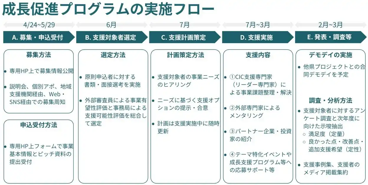 本プログラムの採択企業には、メンタリング、マッチング、セミナーなど、CICの有する国内外のネットワークや千葉県内の支援機関のリソースを活用し、採択企業のニーズに合わせたテーラーメイドの支援が提供されます。 |