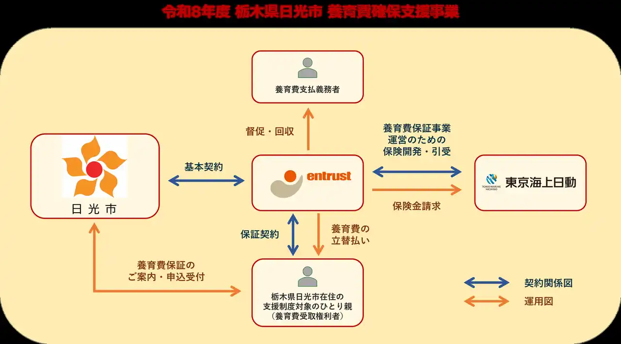 株式会社イントラスト(本社:東京都千代田区、代表取締役社長:桑原 豊、以下「イントラスト」)は、東京海上日動火災保険株式会社(本社:東京都千代田区、取締役社長:城田 宏明、以下「東京海上日動」)と開発を進めていた自治体向け養育費保証モデルについて、この度、栃木県日光市(市長:瀬高 哲雄、以下「日光市」)に採用され、2026年4月1日より運用を開始いたしました。栃木県内での導入は、同市が初となります。 |