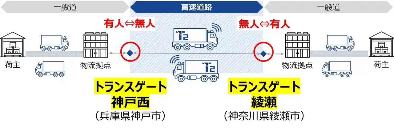 株式会社T2(東京都千代田区、代表取締役CEO:熊部 雅友、以下「T2」)は、レベル4*¹自動運転トラックによる幹線輸送サービスの実現に向けて、物流事業者として国内で初めて*²、高速道路における無人運転と一般道での有人運転を切り替える拠点(以下、「切替拠点」)として、神奈川県綾瀬市に「トランスゲート綾瀬」を、兵庫県神戸市に「トランスゲート神戸西」をこのほど設置しました。 |