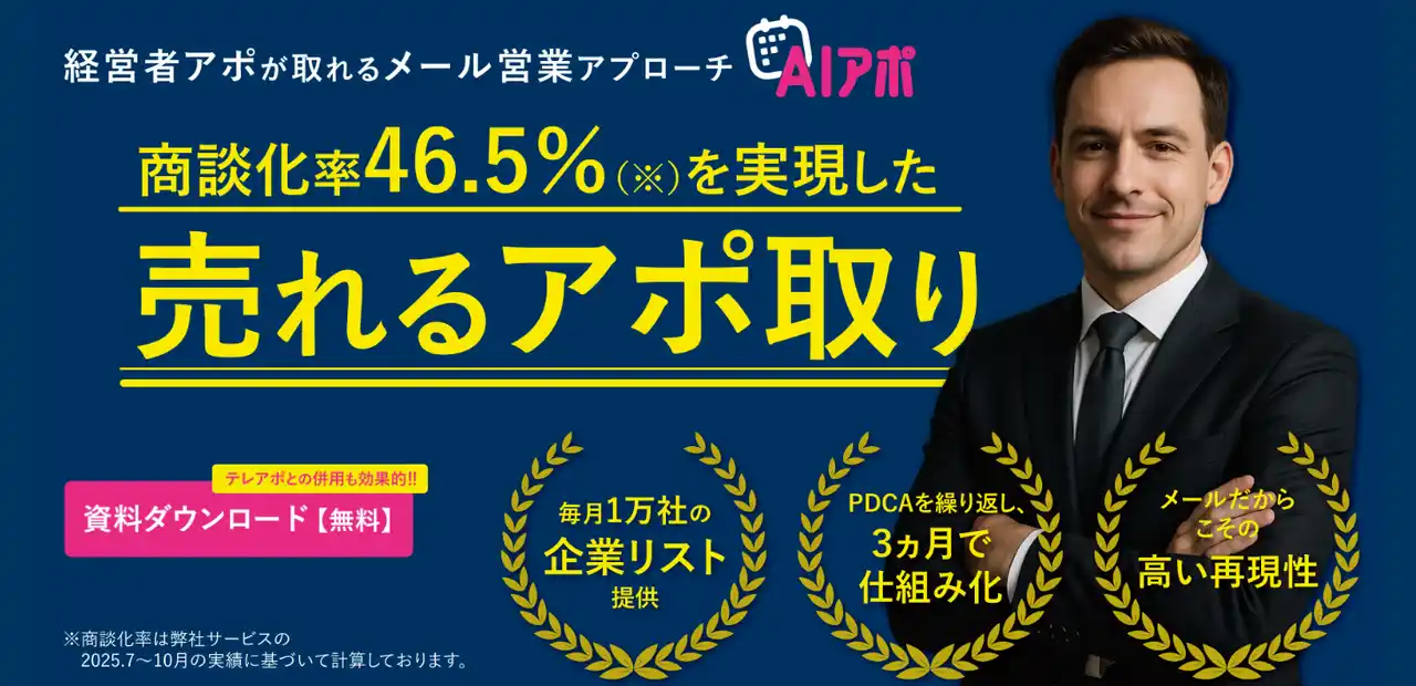 | 『AIアポ』は、AI×コールドメールを活用してBtoB企業の質の高い商談獲得を支援するサービスです。 | |||