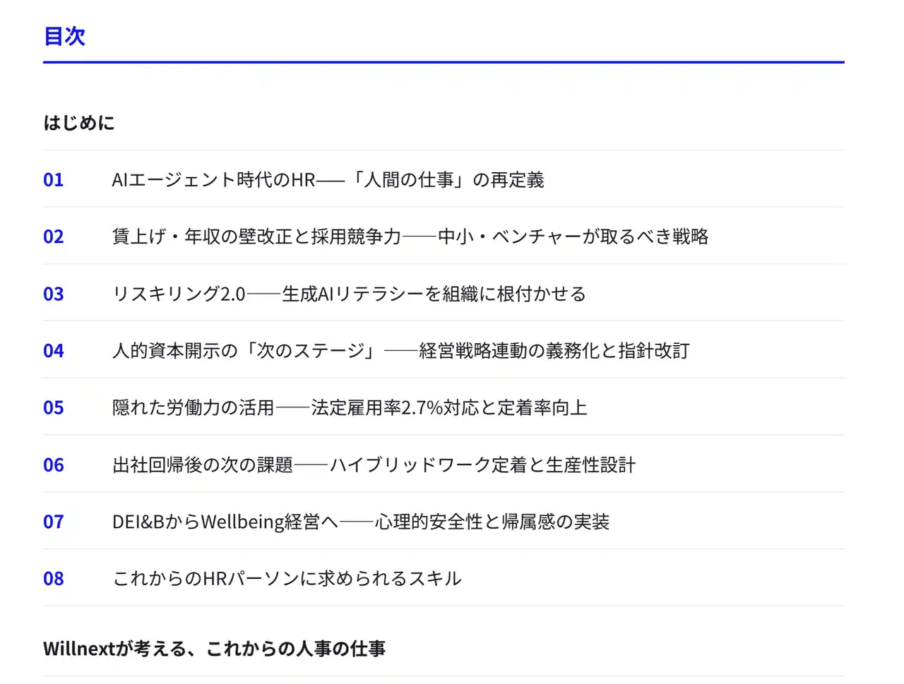 2025~2026年のHR領域は、生成AIの職場への本格浸透、人的資本開示の義務化、年収の壁改正、障がい者雇用率の引き上げなど、制度・技術・市場の変化が同時多発的に押し寄せている時期です。 |