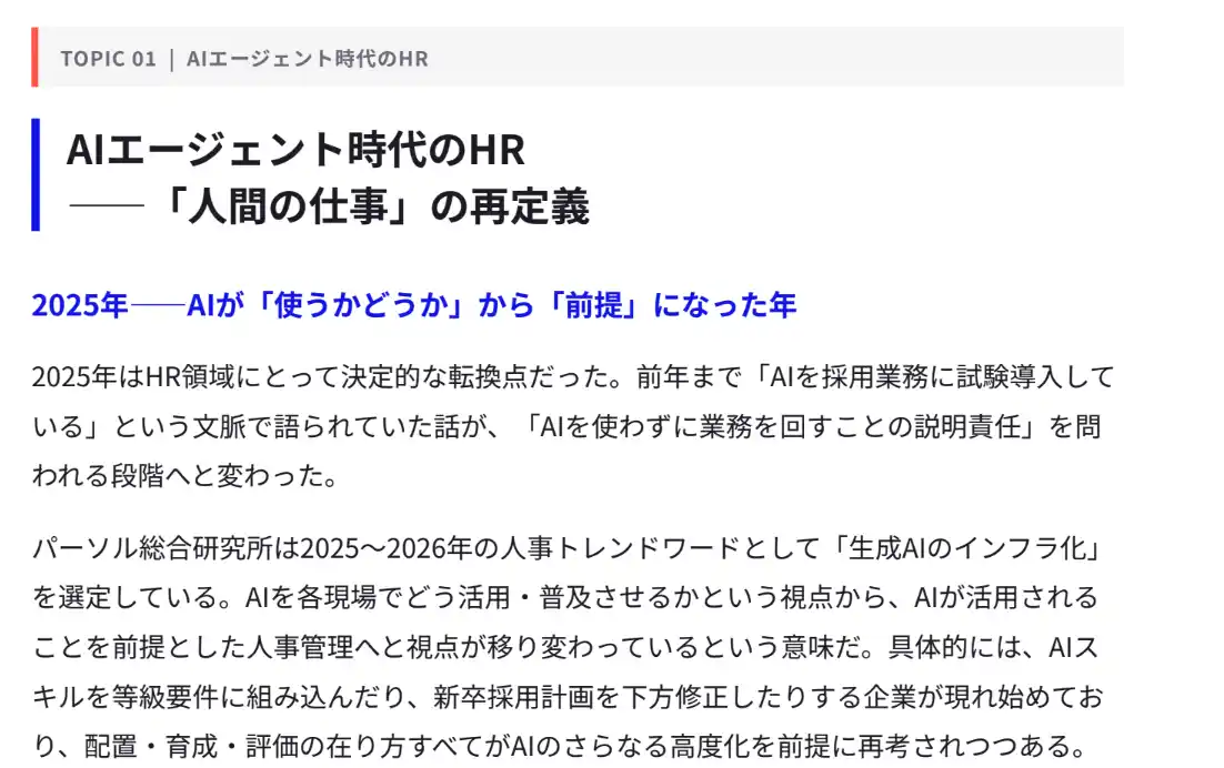 情報収集のコストが下がった今、単なるトレンドの整理に留まらず、「そのデータから何を読み取るか」という解釈の質が、HR担当者の競争力を左右します。 |