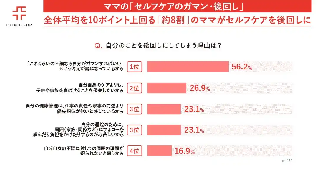 | 後回しにしてしまう理由として、最も多かったのは「自分がガマンすればいいという考えが癖になっている(56.2%)」でした。また、次に「自分自身のケアよりも、子供や家族を喜ばせることを優先したいから(26.9%)」という理由も多く、日々の忙しさの中で、家族の笑顔や生活の維持を最優先するあまり、自身の不調をケアすることを二の次にしてしまう、ママたちの自己犠牲的な習慣が示唆されます。 | |||