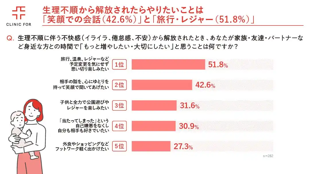 ・生理不順から解放されたらやりたいことは「笑顔での会話(42.6%)」と「旅行・レジャー(51.8%)」 |