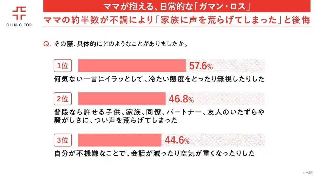 | ・ママの約半数が不調により「家族に声を荒らげてしまった」と後悔。 | |||