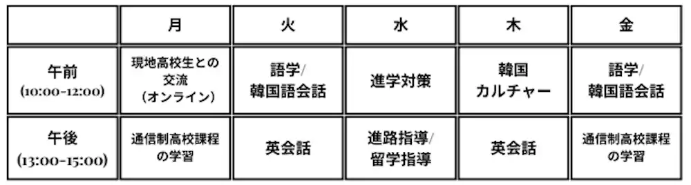 週5日の語学学習と個別の進路指導が軸で、韓国語・英語はゼロスタートからOK。ネイティブ講師によるゲームや会話中心の授業で語学力だけでなく文化的な理解も深めます。 |