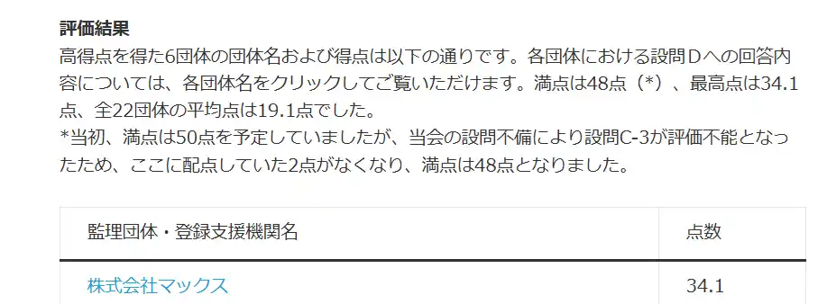 その中で当社は34.1点を獲得し、参加22団体の中で最高得点を記録いたしました。上位団体の中においても、相対的に高い評価を頂戴しております。 |