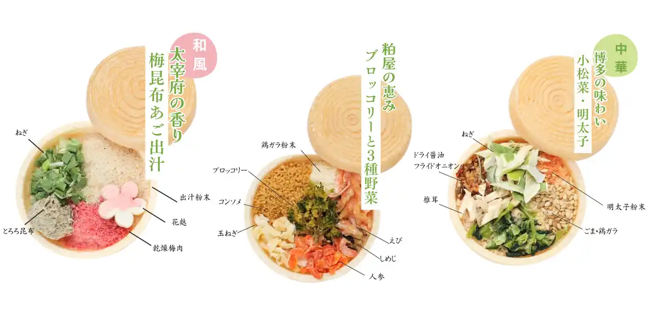 太宰府を象徴する梅の香りがふわりと立ち上り、とろろ昆布とあご出汁の深みのあるやさしい旨味がほっと包み込む和風味 |