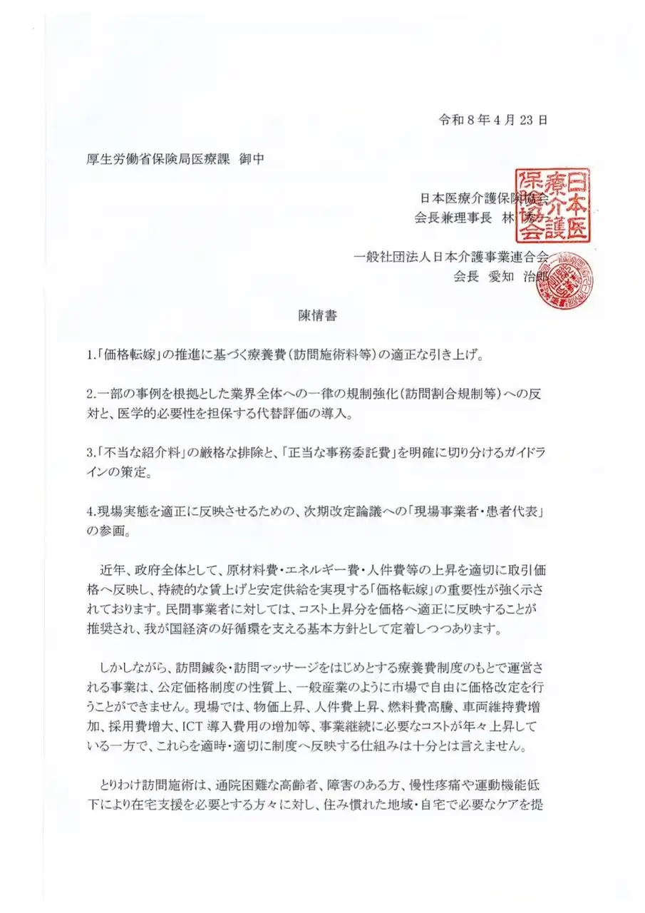 高齢者・身体障がい者向け訪問鍼灸マッサージを全国展開する株式会社からだ元気治療院(https://www.karada-genki.com/)は、2026年4月23日、日本医療介護保険協会・一般社団法人日本介護事業連合会との連名で、厚生労働省保険局医療課へ陳情書を提出し、担当官との意見交換を行いました。 |