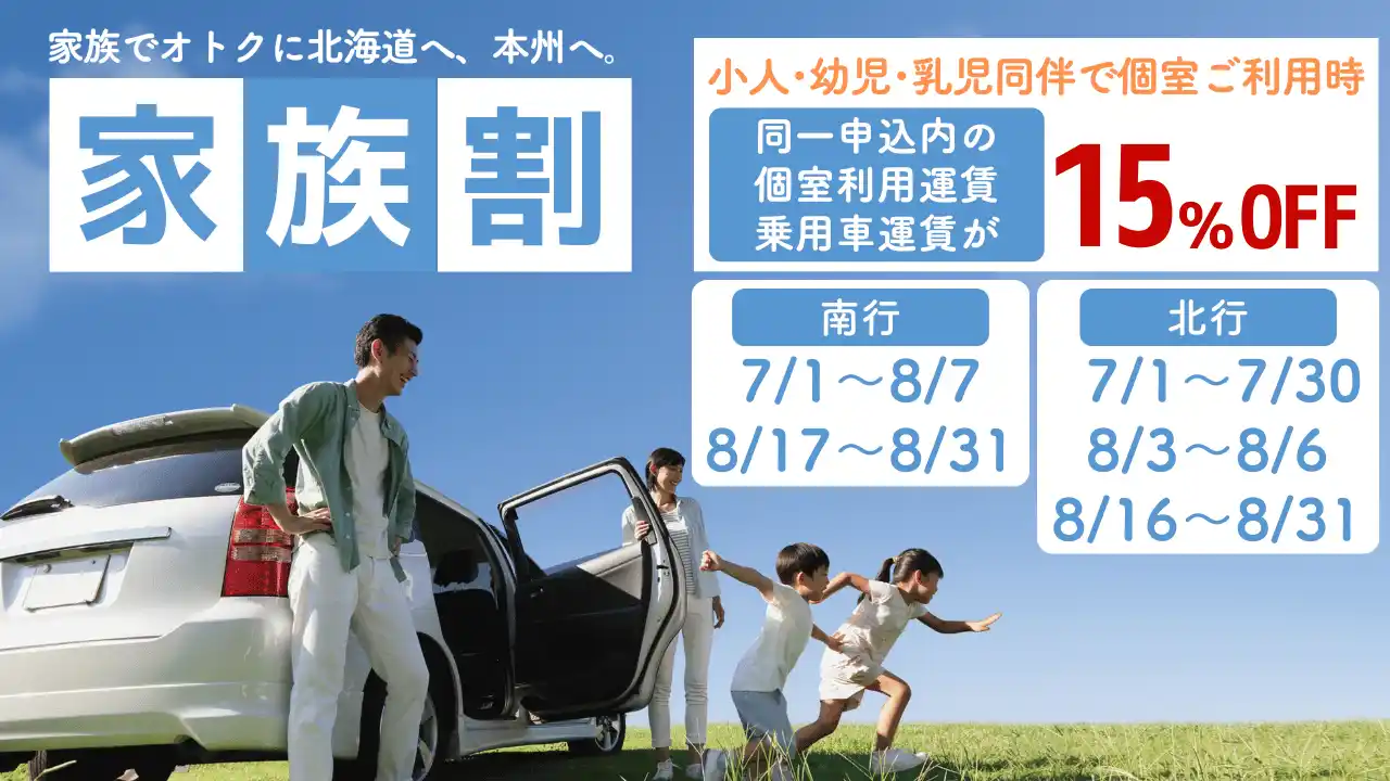 【利用期間】 (北行)2026年7月1日~7月30日、8月3日~8月6日、8月16日~8月31日 (南行)2026年7月1日~8月7日、8月17日~8月31日 【対象航路】全航路 【対象運賃】スイートルーム・ジュニアスイートルーム・デラックスルームA/B・ステートルームS/A/B・乗用車 【割引】同一申込内の個室利用運賃・乗用車運賃が15%OFF 【適用条件】 ・小人、幼児、 乳児いずれかのお子様同伴で個室利用(同一申込内に限る) ・ご乗船の14日前まで『家族割』を適用しご予約されたお客様 その他詳しい割引条件は下記URLをご確認ください。 乗船のご予約はインターネットまたはお電話にて受付中です。 ●『家族割』詳細は下記URLにて https://www.snf.jp/campaign/familydiscount/ ●新日本海フェリー インターネット予約 https://frens.snf.co.jp/ |