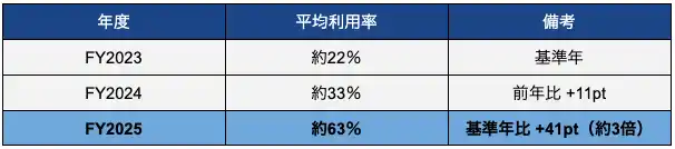 その結果、同機能の利用率はFY2023の約22%からFY2025には約63%へと3年で約3倍に急伸し、1案件あたり平均72名の買い手候補にオファーを送信していることが判明しました。 |
