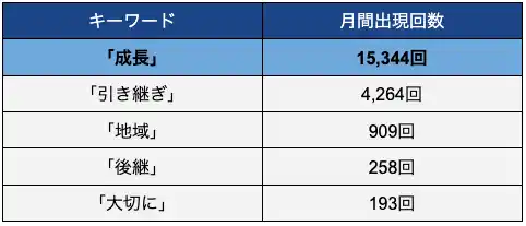最多の「成長」は月間15,000回を超え、売り手が事業の将来的な発展を最も重視していることがわかります。「引き継ぎ」「地域」「後継」「大切に」が上位に並ぶことからも、金額や条件面だけでなく、事業への愛着と後継者への期待が、オファーの動機の中核を成していることが読み取れます。 |