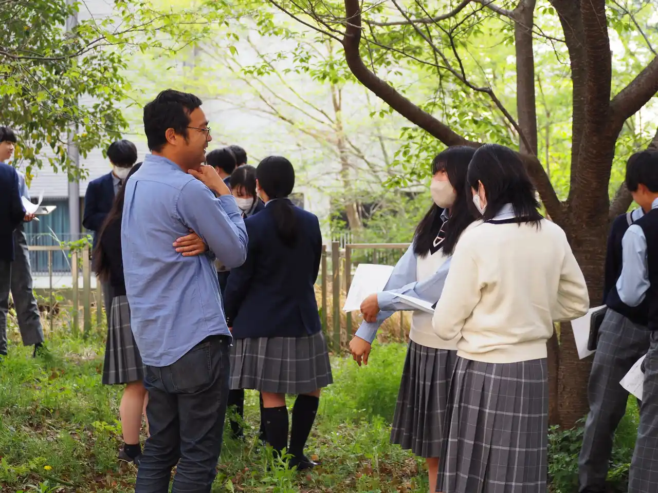 4月14日(火)には初回授業を実施し、明石准教授によるオリエンテーションの後、実際の現場にて観察を行いました。生徒たちは、土壌や植生の状態、小さな生き物の存在などに着目し、今後のガーデンづくりに向けた検討を開始しています。 |