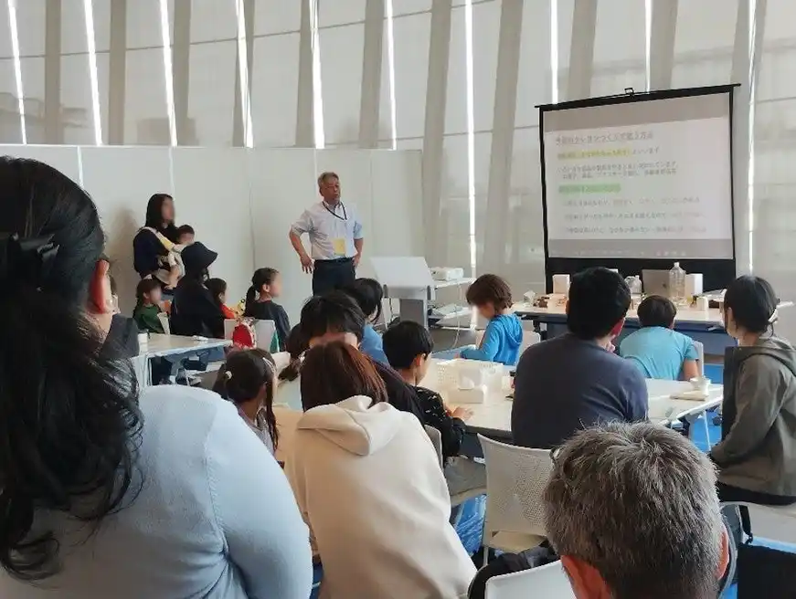 4月18日、19日にかけて計6回がほぼ満席で開催された同ワークショップでは、まずフードロスや温室効果ガス排出といった社会課題の解説に続き、当日使用するmizuiroのアップサイクル商品「おこめのクレヨン(R)」や、住友電工の未来素材「メタコル(TM)」による課題解決ストーリーがわかりやすく解説されました。 |